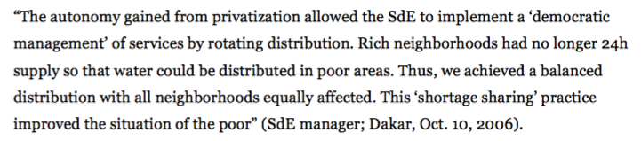 From a social standpoint, “access to drinking water increased from 79% in 1996 to 91% in 2006” in the Dakar area. Nonetheless, the reform left the low-income households with “unaffordable, insufficient and low quality supply”, in comparison with wealthy areas (Theven de Gueleran, 2012). Indeed, price increase and distribution in priority to zones with high demand leave the poor areas with irregular supply, low water pressure and polluted groundwater, while they cannot compensate availability problems with adequate storage and filtration.