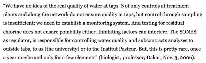 Nevertheless, many boreholes pumping in polluted tables still feed the distribution network of Dakar. This contaminated water “is officially diluted with better quality water”. For instance, “at the Thiaroye plant, water from the Thiaroye and Sebikotane tables is diluted with water from the Lake of Guiers” and clean tables (Theven de Gueleran, 2012). However, there is not any control of proportions, while the priorities are satisfying demand and ensuring pressure, leading to the absence of dilution at peak hours. Polluted water is therefore directly spilled into the network and ineluctably received by the poor peri-urban neighbourhoods which are closer to the boreholes.